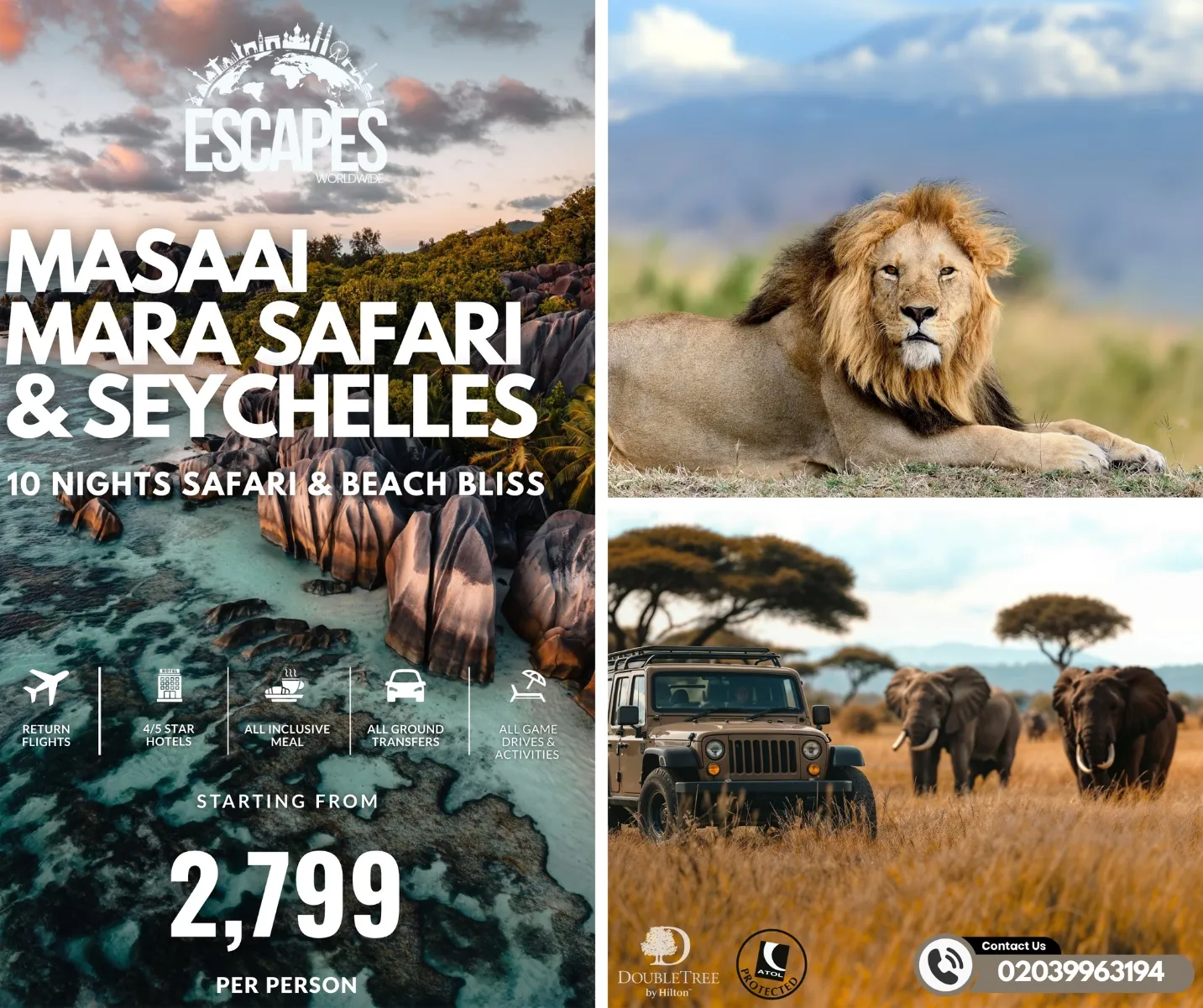 This once-in-a-lifetime journey blends thrilling game drives in Kenya’s Maasai Mara with pure relaxation on the beaches of the Seychelles. Experience 5 days of African adventure followed by 6 nights of island bliss at a 5★ beachfront resort.